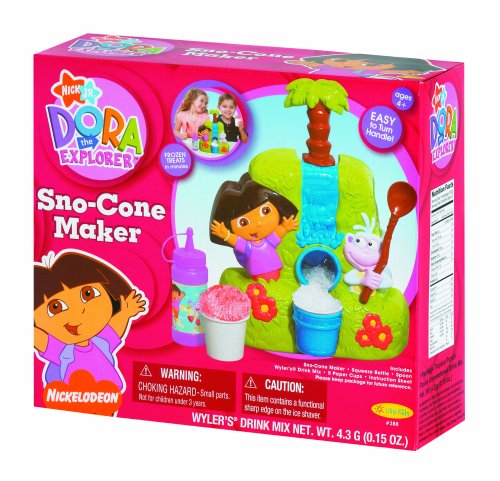 Dora Sno Cone Maker turn oridianry ice into tasty tropical treats.tropical treats Creates healthy treats with Fruit Juice -- set includes Sno-Cone Maker, flavor squeeze bottle, Wylers sugar free flavoring, spoon, paper cups and instructions